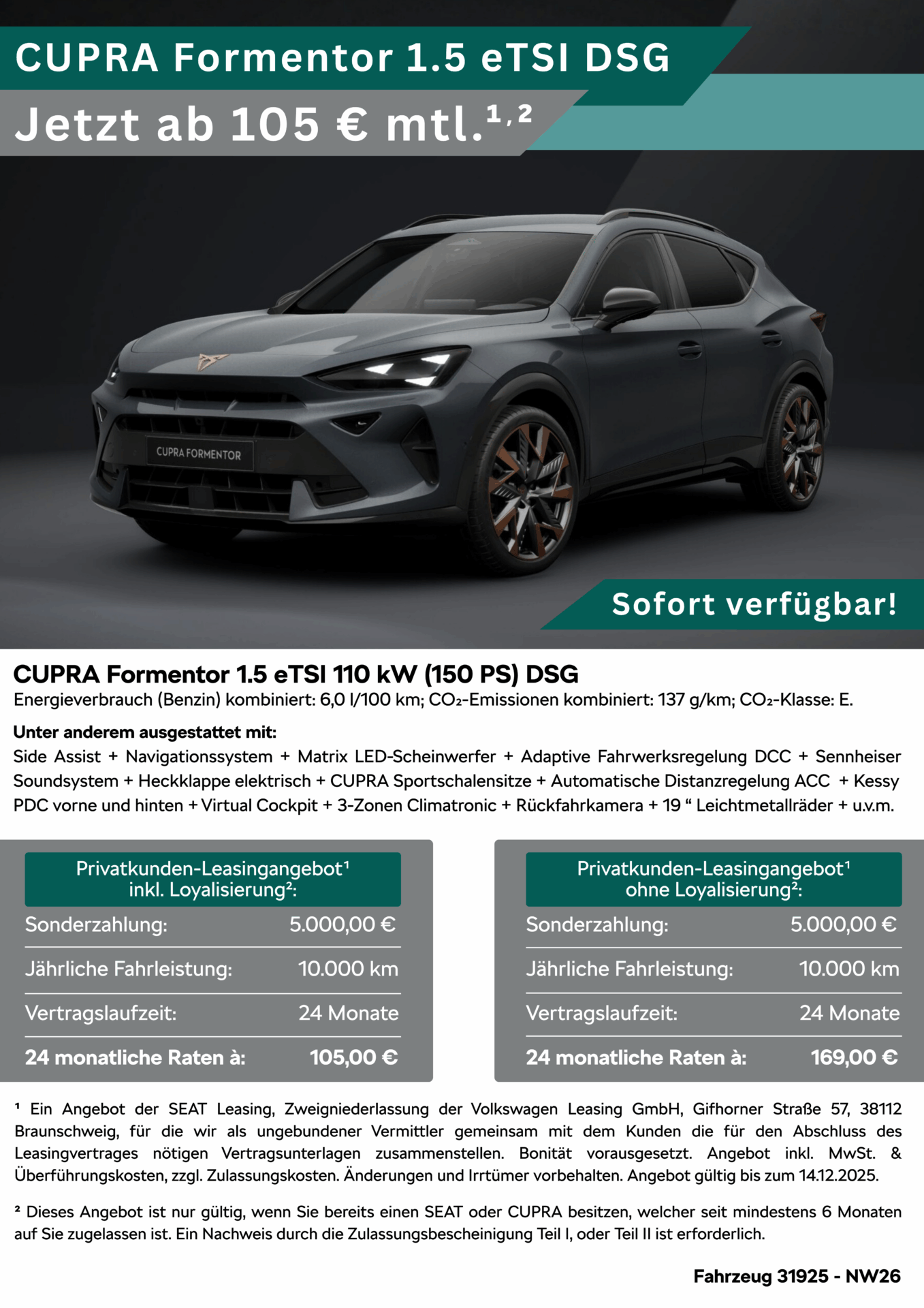 ¹ Ein Angebot der SEAT Leasing, Zweigniederlassung der Volkswagen Leasing GmbH, Gifhorner Straße 57, 38112 Braunschweig, für die wir als ungebundener Vermittler gemeinsam mit dem Kunden die für den Abschluss des Leasingvertrages nötigen Vertragsunterlagen zusammenstellen. Bonität vorausgesetzt. Angebot inkl. MwSt. & Überführungskosten, zzgl. Zulassungskosten. Änderungen und Irrtümer vorbehalten. Angebot gültig bis zum 19.12.2025.