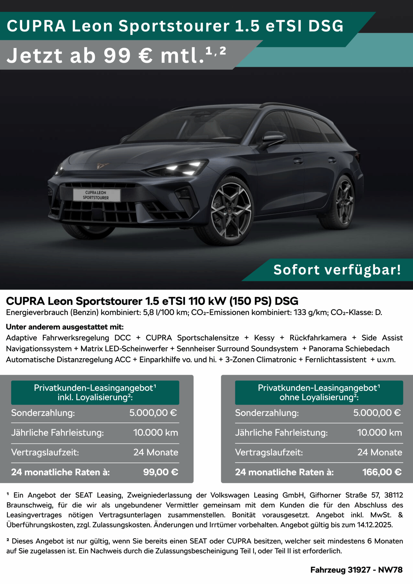 ¹ Ein Angebot der SEAT Leasing, Zweigniederlassung der Volkswagen Leasing GmbH, Gifhorner Straße 57, 38112 Braunschweig, für die wir als ungebundener Vermittler gemeinsam mit dem Kunden die für den Abschluss des Leasingvertrages nötigen Vertragsunterlagen zusammenstellen. Bonität vorausgesetzt. Angebot inkl. MwSt. & Überführungskosten, zzgl. Zulassungskosten. Änderungen und Irrtümer vorbehalten. Angebot gültig bis zum 19.12.2025.