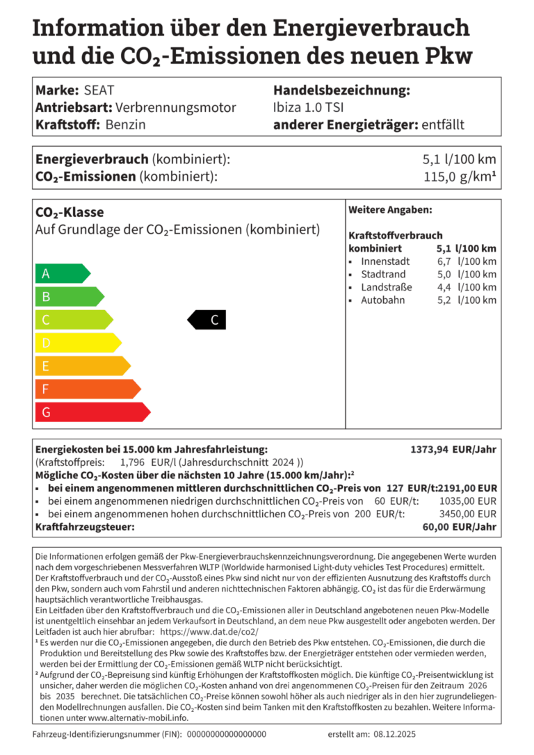 Energieverbrauch (Benzin) kombiniert: 5,1 l/100 km; CO₂-Emissionen kombiniert: 115 g/km; CO₂-Klasse: C.
