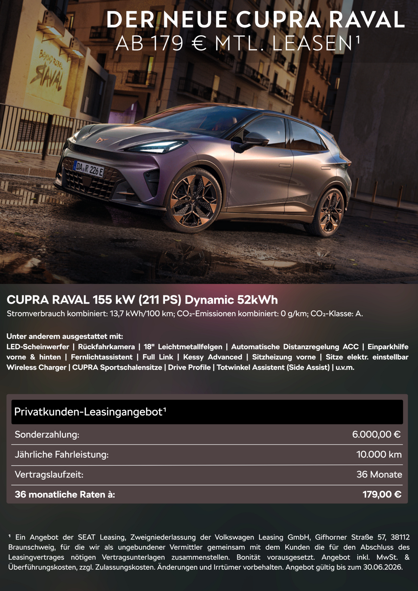 ¹ Ein Angebot der SEAT Leasing, Zweigniederlassung der Volkswagen Leasing GmbH, Gifhorner Straße 57, 38112 Braunschweig, für die wir als ungebundener Vermittler gemeinsam mit dem Kunden die für den Abschluss des Leasingvertrages nötigen Vertragsunterlagen zusammenstellen. Bonität vorausgesetzt. Angebot inkl. MwSt. & Überführungskosten, zzgl. Zulassungskosten. Änderungen und Irrtümer vorbehalten. Angebot gültig bis zum 30.06.2026.