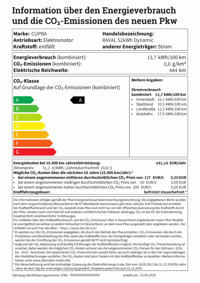 Stromverbrauch kombiniert: 13,7 kWh/100 km; CO₂-Emissionen kombiniert: 0 g/km; CO₂-Klasse: A.