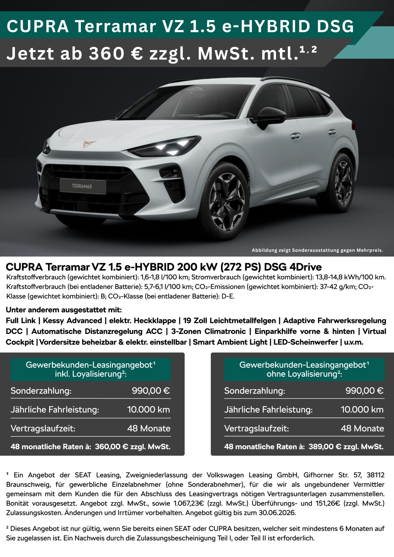 ¹ Ein Angebot der SEAT Leasing, Zweigniederlassung der Volkswagen Leasing GmbH, Gifhorner Str. 57, 38112 Braunschweig, für gewerbliche Einzelabnehmer (ohne Sonderabnehmer), für die wir als ungebundener Vermittler gemeinsam mit dem Kunden die für den Abschluss des Leasingvertrags nötigen Vertragsunterlagen zusammenstellen. Bonität vorausgesetzt. Angebot zzgl. MwSt., sowie 1.067,23€ (zzgl. MwSt.) Überführungs- und 151,26€ (zzgl. MwSt.) Zulassungskosten. Änderungen und Irrtümer vorbehalten. Angebot gültig bis zum 30.06.2026.