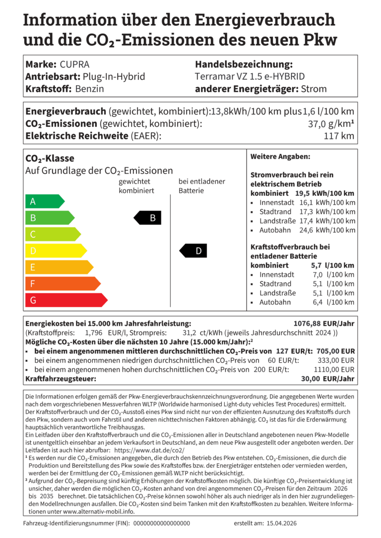 z.B. CUPRA Terramar VZ 1.5 e-HYBRID 200 kW (272 PS): Kraftstoffverbrauch (gewichtet kombiniert): 1,6-1,8 l/100 km; Stromverbrauch (gewichtet kombiniert): 13,8-14,8 kWh/100 km; Kraftstoffverbrauch (bei entladener Batterie): 5,7-6,1 l/100 km; CO₂-Emissionen (gewichtet kombiniert): 37-42 g/km; CO₂-Klasse (gewichtet kombiniert): B; CO₂-Klasse (bei entladener Batterie): D-E.