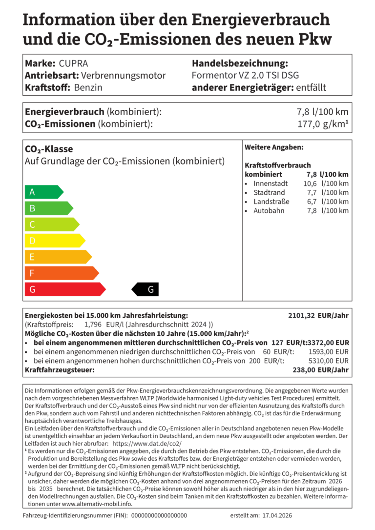 Kraftstoffverbrauch (kombiniert): 7,8 l/100km. CO₂-Emissionen (kombiniert): 177 g/km; CO₂-Klasse: G