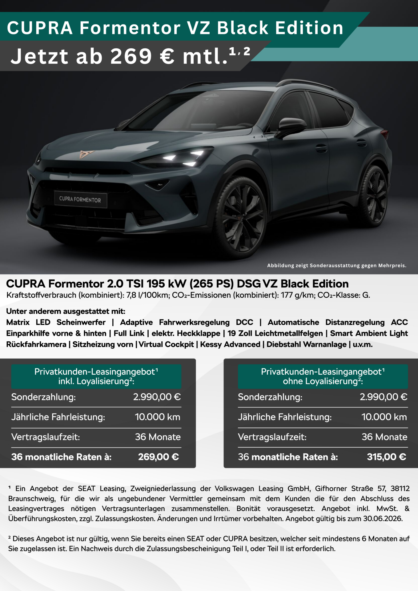 z.B. CUPRA Formentor 2.0 TSI 195 kW (265 PS) DSG VZ Black Edition